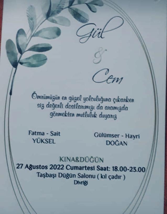 Köylümüz "Karahasan'in" Oğlu Hayri Dogan'in Oğlu Cem'in 27 Agustos 2022 Cumartesi günü saat 18 00 23 00 arasında Divriği Taşbaşı Salonun'da düğün merasimi düzenlenecektir.