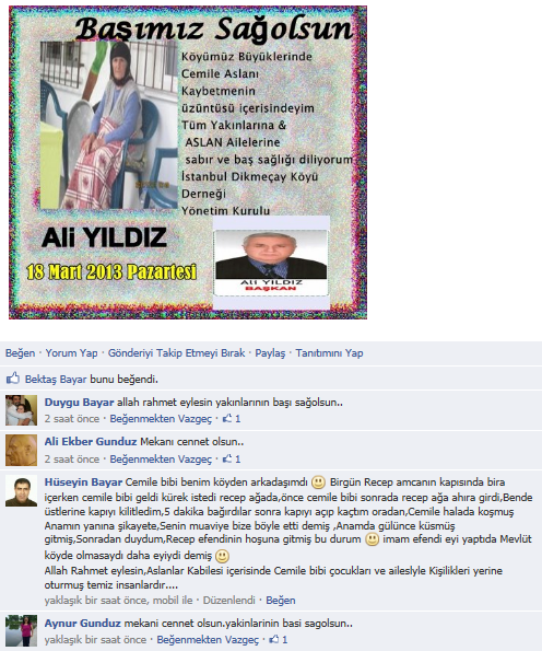 Kurucu üyelerimizden Yusuf ASLAN ve Mevlüt Aslanın Anneleri Cemile Aslan Saat 13 30' da Hakkın rahmetine kavuşmuştur. Annemize Allahtan Rahmet Yakınlarına ve ASLAN Ailelerine Baş sağlığı dileriz...